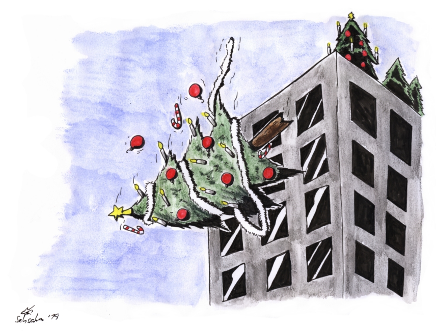 Alles scheint nach rechts verschoben Selbst die Klinkerbauten schwanken Auf dem Kaufhausdach weit oben Ist ein Weihnachtsbaum am Wanken Kugeln, Kerzen und Lametta Neigen sich dem Abgrund zu Finden schließlich mit Geschmetter Auf dem Asphaltboden Ruh